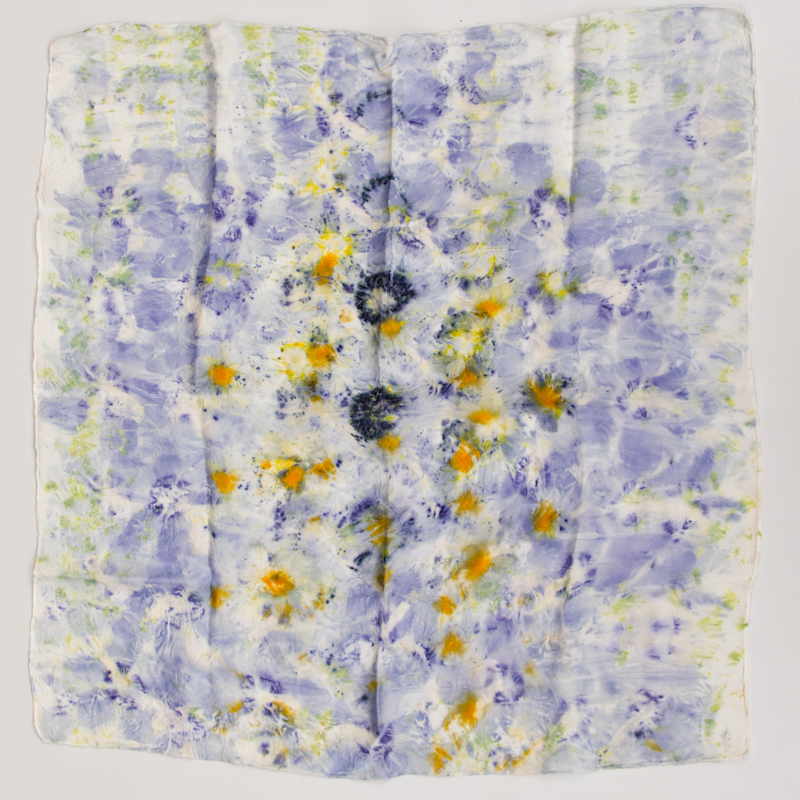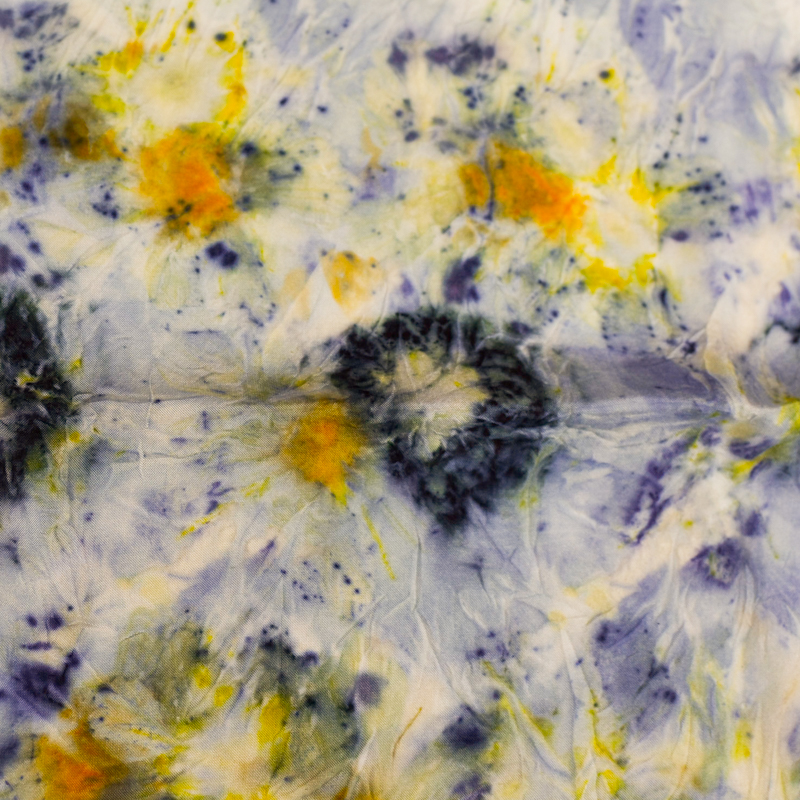 This special natural dye technique captures the beauty and color of the flowers as eco-prints on the fabric. It is color-fast. These pieces work in conjunction with restorative gardening, as the flowers are native, supporting pollinators.