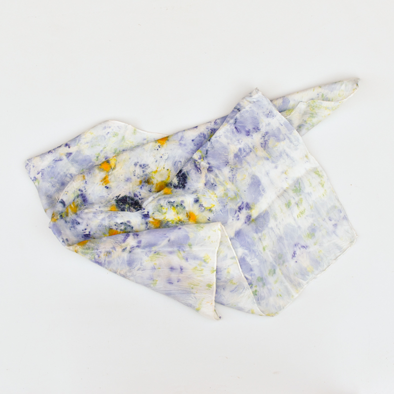 Unique, light, and fluid silk scarf featuring an abstract pattern made from the rose of sharon, cosmos, and purple pincushion flowers. Each flower leaves its own distinctive mark, creating a special, one-of-a-kind piece.